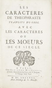 LA BRUYÈRE (Jean de).{CR}Les Caractères de Théophraste traduits du grec. Avec les caractères ou les moeurs de ce siècle.{CR}Paris : Estienne Michallet, 1688. —