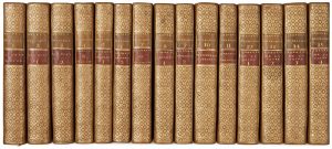 15 volumes in-8, 197 x 124. Veau blond, triple filet doré en bordure des plats, dos lisse orné à la grotesque, tranches rouges (reliure de l’époque).{CR}{CR}Cordier, 1. - Cohen, 636-637.{CR}{CR}Première édition collective recherchée, illustrée en premier tirage du portrait de l’auteur par Guélard et de 32 figures hors texte de Marillier gravées par Dambrun, de Launay, Delvaux, Longueil, Pauquet, Madame Ponce, etc.{CR}Très bel exemplaire en veau de l’époque, très bien conservé. Restauration dans la marge du feuillet E1 dans le tome 1. Mouillure pâle aux premiers feuillets du tome 12.