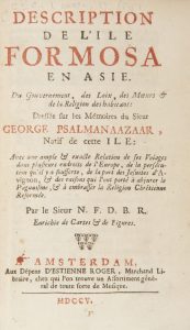 PSALMANAZAR (George).{CR}Description de l’île Formosa en Asie. Du Gouvernement, des Loix, des Mœurs & de la Religion des habitans.{CR}Amsterdam : aux dépens d’Estienne Roger, 1705. —