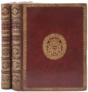2 volumes in-4, 252 x 183 : (20 ff.), 464 pp., (2 f.) ; 432 pp. Maroquin rouge, roulette dorée en encadrement et armes dorées au centre sur les plats, dos à nerfs orné, roulette dorée intérieure, tranches dorées (reliure de l’époque).{CR}{CR}Nouvelle édition, dédiée au roi, de cette histoire de Charles IX composée par l’historiographe Antoine Varillas (1620?-1696). Elle parut pour la première fois en 1683. Le premier volume est daté 1686, le second 1685.{CR}Très bel exemplaire aux armes de René-François, marquis de La Vieuville (1652-1719). Ce dernier était un des grands bibliophiles de la fin du XVIIe et du début du XVIIIe siècle. Amateur de belles reliures, il faisait le plus souvent réaliser les siennes par Boyet, relieur du roi. Celle du présent exemplaire semble sortir des ateliers de l’imprimerie royale du Louvre, comme le laisse supposer la présence autour des armes d’une bordure dite «du Louvre», caractéristique de ces ateliers.{CR}Frottements d’usages aux coiffes et aux coins, petites taches sur les plats. Feuillets brunis, importantes taches à plusieurs feuillets dans le premier volume.{CR}Provenances : René-François, marquis de la Vieuville, avec ses armes sur les plats. - Ex-libris armorié du XIXe siècle. - Ex-libris armorié moderne.