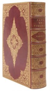 In-8, 257 x 164 : portrait, faux titre gravé, LVI, 458 pp., (7 ff.), 34 planches, 1 carte. Cuir de russie bordeaux, plats richement ornés de motifs de volutes et de fleurs aux angles, bordés d’un cadre de filets et de roulettes dorés, et au centre d’un quadrilobe entouré de motifs de volutes dorées formant un losange, dos à nerfs orné, doublures et gardes de chagrin vert orné d’une large dentelle dorée, doubles gardes, tranches dorées, étui (Cocheu).{CR}{CR}UN DES SOMMETS DU LIVRE ILLUSTRÉ ROMANTIQUE, orné de 450 vignettes gravées sur bois dans le texte, d’une carte en couleurs de l’île-de-France, gravée par Dyonnet, ainsi que de 36 planches, dont 7 portraits, sur papier de Chine collé, à l’exception du portrait du docteur. Seuls les 7 portraits ont été gravés sur acier, les autres planches ont été gravées sur bois. Ces compositions sont de Meissonier, Isabey, Tony Johannot, Marville, etc.{CR}Exemplaire comprenant la plupart des caractéristiques du premier tirage. Le portrait de l’auteur est avec la sphère. Celui de La Jeune Bramine est en double état, celui sur chine collé sans l’étoile, et celui sur vélin avec l’étoile ; « cette dénomination provient d’un défaut dans le cuivre qui, se trouvant justement sur le front du sujet, laissa dans les épreuves un petit blanc qui fut pris pour une étoile ! » Le défaut aussitôt relevé fut rectifié et peu d’exemplaires comportent cette particularité. La notice de Sainte Beuve est terminée par 9 lignes. À la fin de la table des dessinateurs on lit : Tous les dessins des grandes lettres de la Flore sont de M. Français, remarque de second tirage mais le cul-de-lampe à la fin de la table des grandes vignettes représente bien le médaillon d’Orrin Smith, caractéristique du premier tirage.{CR}Le titre est de première émission, à l’adresse de la rue Saint-Anne. Le portrait de Madame de La Tour est de Tony Johannot et celui du docteur est de Meissonnier.{CR}Exemplaire enrichi de 2 portraits de l’auteur sur chine appliqué, l’un gravé par Frédéric Lignon d’après Girodet-Trioson, daté de 1818, provenant de l’édition de Méquignon-Marvis de 1818, le second en tête de La Chaumière indienne, non signé.{CR}On y trouve également :{CR}- 4 figures sur vélin avant la lettre, gravées par Roger et Bovinet d’après Lafitte, Prudhon, Isabey et Girodet-Trioson,{CR}- 2 eaux-fortes sur chine de V. Foulquier pour l’édition Jouaust de 1869,{CR}- 5 figures sur vélin avant la lettre, gravées sur cuivre par Dambrun, de Longueil, Müller et Delignon d’après Moreau le Jeune, Desenne et Vernet,{CR}- 4 figures sur chine collé, gravées sur cuivre par Rouargue, Larcher et Blanchard d’après Desenne,{CR}- 2 figures sur vélin gravées par Lecomte et Pigeot d’après Desenne,{CR}- 1 figure avant la lettre sur chine collé, non signée (p. 139),{CR}- 1 figure sur chine collé, gravée sur bois par O. Smith (p. 161),{CR}- le portrait anglais du docteur, sur chine collé, gravé par H. Cook d’après f. Parsons.{CR}Très bel exemplaire en reliure doublée de Cocheu, relieur de Tours du milieu du XIXe siècle.{CR}Charnière du premier plat malheureusement fendue mais solide, celle du second plat est fendillée. Quelques rares rousseurs éparses, sans gravité.{CR}Provenance : ex-libris JH.