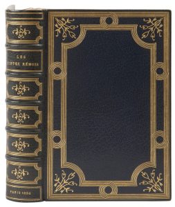 In-12, portrait, (2 ff.), 239 pp., 1 portrait, couverture illustrée. Maroquin bleu, plats ornés d’un large encadrement composé de deux rangs de 6 filets dorés entrelacés, fleurs dorées aux angles, dos à nerfs orné, encadrement de maroquin bleu à l’intérieur, orné d’un double filet doré et d’un fer floral doré aux angles, doublures et gardes de soie moirée bordeaux, tranches dorées sur témoins, couverture et dos conservés (Marius Michel).{CR}{CR}Troisième édition, contenant 40 contes, soit 12 de plus que dans l’édition de 1843.{CR}Elle est illustrée en premier tirage de deux portraits gravés par Jean-Marie Buland d’après Ernest Meissonier, l’un représentant Chevigné, l’autre Charles-Guillaume Sourdille de La Valette, auteur des Fables illustrées par Grandville, sous lequel figure pour la première fois l’épître en vers qui lui est adressée, et de 41 vignettes gravées sur bois, la majorité d’après Meissonier et quelques-unes d’après Valentin Foulquier.{CR}Selon Carteret : « cette illustration des Contes rémois, admirablement gravée sur bois, restera comme une des plus belles productions romantiques » (III, p. 158).{CR}Exemplaire unique, auquel on a ajouté à la fin 16 contes provenant des éditions de 1861 pour les 9 premiers et de l’édition de 1868 pour les suivants, chacun illustré d’une vignette par Meissonnier. Une table manuscrite de ces 16 contes, parfaitement calligraphiée, a été ajoutée à la suite.{CR}L’exemplaire est en outre truffé d’un portrait de l’auteur en médaillon gravé sur cuivre par Jean-Marie Buland d’après Auguste Debay, du portrait d’un homme barbu, sur chine collé et non signé, ainsi que d’un second portrait de La Valette, représenté en médaillon, gravé par Buland d’après Meissonnier.{CR}On trouve également :{CR}- la figure sur chine collé représentant Chevigné offrant son ouvrage à un ecclésiastique, provenant de l’édition de 1861,{CR}- 50 fumés placés en regard des vignettes correspondantes,{CR}- 15 figures gravées à l’eau-forte par Martin Chablis d’après Meissonier, sur japon pelure, la dernière n’étant pas signée,{CR}- 4 eaux-fortes de Fourquier sur chine collé, pour quatre des contes ajoutés à la fin, reprenant les vignettes dans un format légèrement plus grand.{CR}Superbe exemplaire relié par Marius Michel, complet de la couverture de ton saumon.{CR}Provenance : Raymond Linard, avec ex-libris.