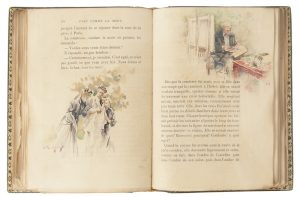 In-18, 183 x 130 : (2 ff.), 353 pp., (1 f. blanc), couverture imprimée. Maroquin bleu, triple filet doré en encadrement entrecoupé aux angles d’un motif d’un nœud de ruban sur les plats, dos à nerfs orné, roulette dorée intérieure, tête dorée, non rogné, couverture et dos conservés (Prouté).{CR}{CR}Édition originale.{CR}Un des 100 exemplaires numérotés sur papier de Hollande.{CR}Exemplaire unique, bien relié par Prouté, ENRICHI DE 17 AQUARELLES ORIGINALES DU PEINTRE ET ILLUSTRATEUR ITALIEN SERAFINO MACCHIATI (1861-1916).{CR}Ce dernier étudia à l’Académie Clémentine de Bologne ; il fut l’un des illustrateurs de la Tribuna illustrata. C’est en 1898 que l’éditeur Lemerre le fit venir à Paris pour illustrer une série de romans de Paul Bourget. Il illustra également des textes de Theuriet, Ferdinand Fabre, Marcel Prévost, etc. Certaines de ses peintures se trouvent au Musée d’Orsay.{CR}Les aquarelles figurent au faux titre et aux pages 1, 57, 58, 83, 84, 135, 136, 153, 154, 155, 214, 215, 238, 263, 300 et 353.{CR}On trouve également relié en tête une L.A.S. DE MAUPASSANT, de 1 page 1 / 4 in-16, adressée à une dame qui souhaite rentrer à son service. Maupassant ne peut pas la garder : « Je ne reste jamais un mois au même endroit, je voyage sans cesse ; et la moitié de mon existence se passe dans mon petit Yacht. Mon personnel se compose donc d’un valet de chambre et de mes matelots ».{CR}Frottements d’usage au dos et aux coins.