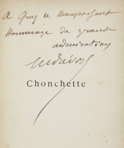 In-16, (3 ff.), 351 pp., couverture imprimée. Demi-maroquin bleu-nuit à la bradel, dos lisse, non rogné, couverture et dos conservés (Kauffmann).{CR}{CR}Édition originale de l’un des premiers romans de Marcel Prévost (1861-1941).{CR}Précieux exemplaire de Guy de Maupassant, enrichi d’un envoi autographe de l’auteur.{CR}Bel exemplaire.