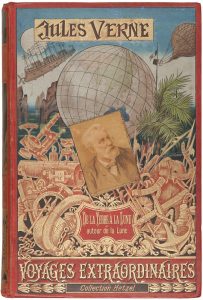 Grand in-8, 270 x 177 : (4 ff.), 170 pp., (1 f.) ; (2 ff.), 180 pp., 8 pp. de catalogue, 4 planches. Cartonnage au portrait collé (A. Lenègre).{CR}{CR}Édition illustrée de 41 compositions et une carte par de Montaut dans De la Terre à la Lune et de 44 dessins par Émile Bayard et A. De Neuville dont 4 hors texte en couleurs dans Autour de la Lune.{CR}Cartonnage au portrait collé ; le second plat est de type Lenègre « e ». À la fin figure le catalogue HF de 1894.{CR}Premier plat sali et terne, frottements d’usage, petits manques au portrait, usures aux coiffes. Rousseurs éparses, restaurations grossières aux premiers feuillets, tache dans la marge des derniers feuillets.