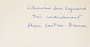 In-8, 255 x 190 : 56 pp. Cartonnage imprimé de l’éditeur sous jaquette illustrée.{CR}{CR}Édition originale du tout premier ouvrage consacré à Henri Cartier-Bresson (1908-2004). Elle comprend deux textes, l’un du poète Lincoln Kirstein (1907-1996) intitulé Henri Cartier-Bresson : documentary humanist, l’autre de l’historien de la photographie Beaumont Newhall (1908-1993) portant sur la technique photographique de Cartier-Bresson ; ils sont suivis d’une chronologie de la vie du photographe, depuis sa naissance en 1908 jusqu’en 1946.{CR}L’édition est illustrée de 44 photographies en noir, dont une sur la jaquette.{CR}Exemplaire enrichi d’un envoi de Cartier-Bresson à l’historien d’art Jean Leymarie (1919-2006).{CR}Ce dernier assura la composition de textes dans deux publications consacrées à Henri Cartier-Bresson, c’est-à-dire dans Henri Cartier-Bresson, dessins 1974-1977 publié en 1997 et dans De quoi s’agit-il ? en 2003.{CR}Exemplaire très bien conservé malgré des déchirures sans gravité au dos de la jaquette.{CR}Provenance : Jean Leymarie, avec envoi de Cartier-Bresson. - Ex-libris MD.