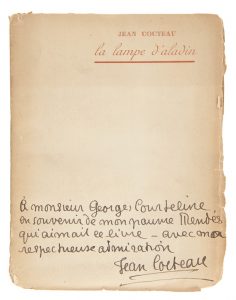 COCTEAU (Jean).{CR}La Lampe d’Aladin. Poèmes.{CR}Paris : Société d’éditions, (1909). —