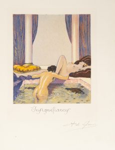 Album in-4, 319 x 224 : 15 planches sous chemise en toile beige à rabats, avec lacets.{CR}{CR}Tirage unique à 225 exemplaires de cette suite de 15 planches érotiques à l’aquatinte en couleurs, dont un titre, un feuillet de dédicace, 2 feuillets de citations, 10 planches légendées et un feuillet de justification. Cette illustration est l’œuvre du graveur et illustrateur suisse André Lambert (1884-1967) qui a utilisé ici son pseudonyme Ansaad de Lytencia.{CR}Un des 200 exemplaires numérotés sur papier vélin d’Arches, celui-ci comprenant tous les feuillets signés par l’artiste.{CR}Un des propriétaires de l’ouvrage a réalisé une couverture sur laquelle il a inscrit le titre de l’œuvre aux feutres rouge et noir. Chemise légèrement salie.