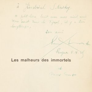 In-8, 250 x 190 : 43 pp., couverture imprimée. Broché.{CR}{CR}Édition originale très rare, tiré à petit nombre sur papier simili japon.{CR}Cet ouvrage est l’un des quatre composés en collaboration par Max Ernst et Paul Éluard, mais il s’agit certainement du plus étonnant. Il se compose de 21 reproductions en noir de collages réalisés par Max Ernst, en regard desquels, excepté pour celui situé en frontispice, figure le poème écrit à quatre mains par l’artiste et l’écrivain destiné à « révéler » l’image sans pour autant la décrire.{CR}Précieux exemplaire du peintre, poète, éditeur, photographe et dessinateur surréaliste tchèque Jindrich Štyrský (1899-1942), portant cet envoi rédigé à l’encre verte par Paul Éluard et signé par lui et Max Ernst :{CR}à Jindrich Stirsky ce petit livre écrit avec mon vieil ami Max Ernst dans le Tyrol, il y a très longtemps, son ami Paul Eluard. Prague 5.4.35. et Max Ernst{CR}Styrský créa avec Toyen (1902-1980), le poète Vítezslav Nezval (1900-1958) et l’artiste Karel Teige (1900-1951), le premier groupe surréaliste tchécoslovaque en mars 1934. En mars de l’année suivante, le groupe invita André Breton et Paul Éluard à donner à Prague une série de conférences et c’est à l’occasion de ce déplacement que cet exemplaire fut offert à Styrský.{CR}Exemplaire parfaitement conservé malgré de légères salissures à la couverture.{CR}Provenances : Jindrich Styrský, avec envoi autographe. - Ex-libris MD.