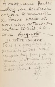In-12, 185 x 127 : 384 pp., couverture imprimée. Demi-chagrin maroquiné havane à la bradel, dos lisse, tête dorée, non rogné, couverture conservée (reliure moderne).{CR}{CR}Édition originale.{CR}UN DES 5 EXEMPLAIRES SUR PAPIER DE HOLLANDE, celui-ci non numéroté mais paraphé par l’auteur.{CR}Il a été enrichi de ce double envoi à l’historien et poète André Lebey :{CR}A mon ami André Lebey, en souvenir et pour le remercier des bonnes soirées où nous détendions un peu l’esprit et le cœur. Augusto{CR}Vous qui avez écrit « Les premières Luttes » vous comprendrez pourquoi ce roman m’est cher. Lisez le avec bienveillance, car il est plein de défauts. AV.{CR}Exemplaire parfaitement conservé.{CR}On joint l’ouvrage dont il est question dans la seconde dédicace :{CR}- LEBEY (André). Les Premières luttes. Paris : Bibliothèque Charpentier, 1897. - In-12, broché.{CR}Édition originale. Un des 11 exemplaires numérotés sur papier de Hollande, celui-ci portant le numéro 1. Couverture déchirée, dos cassé, premier plat de couverture détaché.