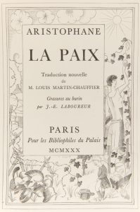 [LABOUREUR (Jean-Émile)] ARISTOPHANE.{CR}La Paix. Traduction nouvelle de M. Louis Martin-Chauffier.{CR}Paris : pour les Bibliophiles du Palais, 1930. —