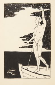 In-4, 284 x 215 : (4 ff.), XXXV pp., (1 f. blanc), 5 planches, couverture illustrée. – Parchemin crème à la bradel, orné sur le premier plat d’un décor composé de coquillages peints à la gouache aux quatre coins des plats et d’un poisson au centre, le second plat est orné d’un coquillage central, dos lisse orné du titre en long, tête dorée, filet doré intérieur, gardes de papier bordeaux peintes à la main de motifs végétaux, couverture et dos conservés (reliure de l’époque).{CR}{CR}Maquette originale unique, entièrement réalisée à la main. Il s’agit d’un prototype complet pour la création d’une édition illustrée d’Arethuse & de L’Homme et la Sirène et de sa reliure. Dans une note manuscrite à la mine de plomb, daté du 10 février 1941, Powilewicz dévoile les secrets de sa « création » :{CR}« Durant ces jours de tristesse, j’ai cherché un refuge en illustrant ces pages de Henri de Régnier – Poésies, d’un passé déjà révolu, choisis comme telles, pour permettre un plus lointain voyage… »{CR}La maquette, dont il n’existe que cet unique exemplaire, est composée d’un prototype de la couverture illustrée en couleurs et du dos réalisé sur papier fort, de l’ouvrage de Régnier, recopié à la plume et illustré de nombreux ornements en noir et rouge dans le texte ainsi que de 5 hors-texte à l’encre de chine sur papier du Japon, et d’une maquette de la reliure avec dessin du décor des plats et échantillon des papiers de garde réalisés à la main.{CR}A. J. Powilewicz est notamment l’auteur d’illustrations pour des ouvrages de Charles Foix (Prométhée, Les Bassarides).