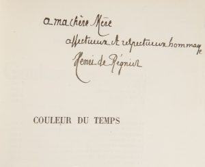 RÉGNIER (Henri de).{CR}Ensemble de 2 ouvrages dédicacés par l’auteur à sa mère :{CR}- Couleur du Temps. Paris : Mercure de France, 1909. –