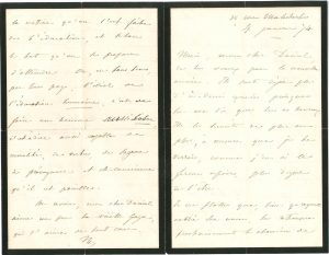 4 pages in-8, enveloppe (deuil). BELLE LETTRE SUR LA QUESTION DE LA LIBERTE, trop vaste et complexe pour être traitée par correspondance. " La liberté étant, aux yeux de la religion et de la philosophie, le caractère essentiel de la nature humaine, l'attribut par excellence qui distingue l'homme de la brute, il en découle pour tous le devoir de développer en soi et en autrui ce principe supérieur de notre existence, dans toute la mesure du possible. La question n'est donc pas du tout de savoir si telle ou telle catégorie d'hommes la désirent, cette liberté, c'est-à-dire cette conscience religieuse, morale et politique. On ne demande pas aux enfants (et tout homme sans culture est un enfant) quel est le régime qui lui convient, ni quel goût il a pour l'instruction. On l'élève selon la notion qu'on s'est faite de l'éducation, et selon le but qu'on se propose d'atteindre. Or, en tous tems, par tous pays, l'idéal de l'éducation humaine, c'est de faire un homme aussi libre, c'est-à-dire aussi capable de moralité, de vertu, de sagesse de prévoyance et de conscience qu'il est possible "...