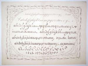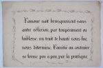 1 page in-plano, et 12 pages in-fol. Exercices de calligraphie de futurs maîtres de l'ÉCOLE NORMALE DU RHONE : alphabets, chiffres et textes édifiants d'Henri d'Apremont, vicomte d'Orthès ; La Bruyère ; Lamartine...