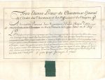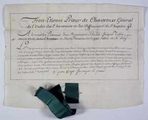 vélin oblong in-4, avec ruban de soie verte. LETTRES D'AFFILIATION A L'ORDRE DES CHARTREUX, accordées par Frère Étienne, prieur de Chartreuse, général de l'Ordre, pour Jean Bonaventure Bertau, Jacques Talbot et Marie-Françoise des Vignes, leur accordant " pleine et entiere participation a toutes les messes, jeunes, veilles oraisons, aumones et a tous nos autres exercices de religion "...