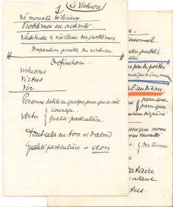 8 et 14 pages in-fol. et 10 pages petit in-4. Plans détaillés de conférences sur la musique : Musique de chambre et Le Virtuose parmi nous aux Annales (1er février 1934 et 28 novembre 1935) ; Amateurs et professionnels ; sur Albert Doyen ; Hommage à la musique française, Fauré-Debussy (tapuscrit joint). ON JOINT un dossier de NOTES autographes pour des conférences sur la musique (30 p. formats divers) ; une note autogr. d'Antoine Duhamel pour son père ; 10 TAPUSCRITS la plupart annotés ou corrigés de textes ou causeries sur la musique : Marius Casadesus, le chef d'orchestre, la flûte, Bach, le chant choral, la musique au Pérou, etc. ; les PLACARDS CORRIGES de La Musique consolatrice (publication prévue au Mercure de France en 1942, interdite par les Allemands), avec le contrat pour l'édition de 1944 aux Éditions du Rocher ; la plaquette La Musique libératrice (Les Fêtes du Peuple, 1921).
