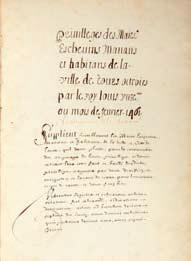 Manuscrit. - Privilleges des Maire Eschevins Manans et habitans de la ville de Tours octroies par le roy louis unzeme au mois de fevrier 1461. S.l.n.d. Manuscrit petit in-folio (environ 290 x 190 mm) de 60 feuillets non chiffrés, veau granité, double