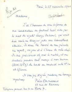 1 page in-4. CANDIDATURE A L'ACADEMIE FRANÇAISE. " J'ai l'honneur de vous informer de ma candidature au fauteuil laissé vide par la mort du regretté Georges Duhamel, qui avait bien voulu me témoigner jadis une bienveillante attention "...