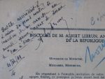 2 pages in-fol. (encadrée). Discours prononcé aux " agapes finales " lors de la 6e exposition des MEILLEURS OUVRIERS DE FRANCE. Lebrun rappelle les origines du mouvement, rend hommage à Georges Contenot et Lucien Klotz, exprime son admiration pour tant de beaux travaux et en particulier pour ceux venus de la France d'outre-mer, " prolongement magnifique de la France métropolitaine "... Il demande une nouvelle épreuve " avant de donner le Bon à tirer "...