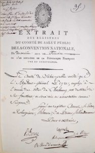 Maximilien de ROBESPIERRE (1758-1794) avocat, conventionnel, chef des Montagnards et du Comité de Salut public. P.S., signée aussi par ses collègues Bertrand BARERE (1755-1841), Jacques-Nicolas BILLAUD-VARENNE (1756-1819), Lazare CARNOT...