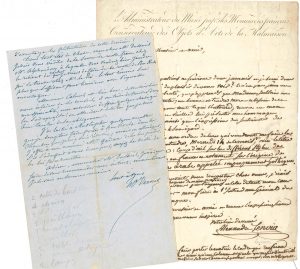 2 pages in-8 chaque. 16 août 1853. Pour éviter " la salissur de me trouver en contact avec ce fripon de Montagne, je suis déterminé à le payer, sous toute réserve de droit contre lui [...] par rapport aux constructions qui ont été faites sur ma terre de Ben-Koula "... Les deux autres affaires doivent suivre leur cours : " la bande de filou qui m'a exploité se trouvera engagée, Montagne en tête "... 11 janvier 1854. Il n'a eu que des avertissements officieux, " sauf une lettre de GENIN qui m'explique pourquoi et comment il a été suspendu de ses fonctions. J'ai remis sa lettre entre les mains du général DAUMAS, un fonctionnaire public s'y trouvant compromis. Si les faits qu'elle contient sont vrais, ce que j'ai lieu de croire, l'affaire peut devenir très grave "... Il voudrait savoir pourquoi le maire de Bouffarik a refusé de " régulariser le procès-verbal dressé par Génin contre un commissaire de police pris en délit de chasse sur sa terre de Ben Koula, en société de transportés politiques "... ON JOINT des L.A.S. d'Alexandre LENOIR, administrateur du Musée impérial des Monumens français (1810) et de Charles Yriarte, plus une L.S. de l'imprimeur Jean-Mathieu Douladoure et un portrait gravé de Paul Delaroche. _x000D_