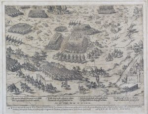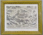 Eau-forte d'après Tortorel et Perrissin. 275 x 200. Bonne épreuve oxydée, en coloris ancien. Numéro 66 à la plume dans l'angle supérieur droit. Plis, rousseurs, épidermures et petites taches marginales. Cadre.