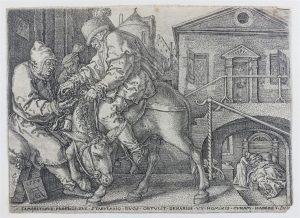 Heinrich Aldegrever (1502-1555) Il charge l'hôte d'en avoir soin (La Parabole du Samaritain charitable, pl. 4 d'une suite de 4). 1554.
