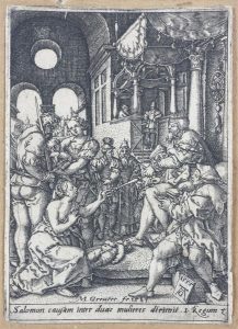 Burin. 104 x 145 et 50 x 70. Bartsch 69 et 113. Bonnes épreuves rognées au sujet, collées par les angles, la 1re tardive, de la coll. Agassis (Lugt 69). Joint : Le Jugement de Salomon. Copie par Greuter d'après Aldegrever. 55 x 80. Burin. Ens. 3 p.