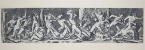 Burin. Bartsch 128. 270 x 65. Bonne épreuve rognée au sujet. Traces de plis, certains frottés ou fracturés. Traces de colle, épidermures et restaurations anciennes visibles au verso. Ex-coll. Agassis (Lugt 69).