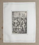 Burin. 30 x 44. Bartsch 197 (copie " des plus trompeuses que l'on puisse s'imaginer "). Bonne épreuve rognée sur le coup de planche et collée. Joint : copie et pl. anciennement attribuée à Beham (rejetée par Bartsch), Mercure. Épreuves rognées au coup de planche. Ens. 3 p.