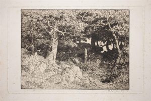 Eau-forte. 210 x 132. Delteil 4. Belle épreuve sur bulle appliqué, du tirage pour la Gazette des Beaux-Arts. Rousseurs claires éparses et petite auréole d'humidité. Courts plis cassés. Petite étiquette au verso. Toutes marges.