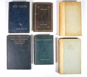 manquante - Intaglios. Page de titre manquante - New poems. Londres, 1880. Page du faux-titre manquante, ex. enrichi d'une carte autographe signée - Songs of consolation. New poems. Londres, 1904. Envoi en français. Carte autographe - The Poems of Master Francis Villon of Paris. Londres, 1886, exemplaire enrichi d'une L.A.S. et d'une C.A.S. de Payne écrites en français