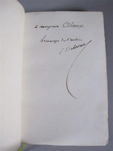 In-12, demi-maroquin à la bradel à coins, dos lisse, couverture et dos conservés.Reliure de CANAPE. EDITION ORIGINALE du premier recueil de poèmes de Verlaine. Exemplaire sur vélin. ENVOI MANUSCRIT SIGNE DU POETE A MONSIEUR ALAUX. Il s'agit de Jules-Emile Alaux ( 1828-1903), écrivain, journaliste à la Revue Française et à la Revue Contemporaine, à l'égard de qui Verlaine fut reconnaissant d'un article élogieux.
