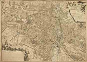janvier 1726 ; 2mars et 28 sept.e 1728 et sous les ordres de Mm. les commissaires nommés par lettres patentes des 12 août 1724, et 29 mars 1728. Paris, 1735. 616 x 846 mm. Grand plan de Paris dressé et publié par l’abbé Delagrive en 1735, et le dernier de la série des 9 plans de Paris dressés pour le Traité de la Police, ouvrage publié par Nicolas Delamare entre 1722 et 1738. Il est orné d’un titre inscrit sur une draperie tenue par un ange et une femme ailée. En bas à gauche, le cartouche contenant la description du plan est orné de Minerve entourée d’amours dessinateurs, à laquelle Mercure rend visite. En haut à gauche, en carton, figurent les limites de La Chapelle et de La Villette. Bon exemplaire. Traces de pliures. (Boutier, 211)