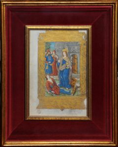 [Livre d'heures]. Feuillet isolé du Livre d'heures à l'usage de Rome, publié à Paris en 1505, par Germain Hardouin, imprimé sur peau de vélin, offrant au v° le texte dans un encadrement gravé, enrichi d'une lettrine enluminée, et au r° une...