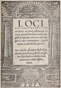 Fort in-8, [16]-264 [sur 269]-[3] f., (sign. A-B 8, a-Ll 8 sauf v 4 à v 8), titre en rouge et noir encadré d'une illustration gravée sur bois, vignette gravée sur bois au dernier f., reliure de l'époque peau de truie sur ais de bois (rel. très usée avec lacunes et travaux de vers, un fermoir arraché, solide ; titre sali avec restaurations ; petite piqûre de vers en début de volume ; marques de crayon, salissures ; il manque les f. 156 à 160).- [Relié à la suite] : Loci insigniores et concordantes ex utroque testamento… [Nuremberg, Peypus, 1526 ?]. In-8, 48-[4] f., titre dans un encadrement gravé sur bois (titre sali, trav. de vers en marge des derniers f.).