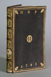 In-8, 192 p. (dont le titre gravé illustré), reliure époque maroquin brun, dos à 5 nerfs, plats bordés d'un quadruple encadrement de filets et pointillés, avec fleurons angulaires et médaillon central au chiffre marial, initiales " M.R.P. " et date 1745 au plat sup., le tout doré, roulette dorée aux coupes, tranches dorées (coiffe de queue arrachée, dos frotté, plats incurvés, légères salissures en marge).