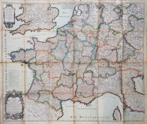 Porte un titre supplémentaire en dehors du cadre : " Carte générale du théâtre de la guerre ". S'étend jusqu'aux états voisins (Sud de l'Angleterre, Pays-Bas, Bohême, nord de l'Italie et de l'Espagne). C'est une carte publiée pour suivre les campagnes révolutionnaires.
