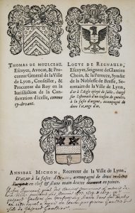 MÉNESTRIER (Claude-François). Éloge historique de la ville de Lyon, et sa grandeur consulaire sous les Romains, & sous nos Rois. À Lyon, chez Benoist Coral, 1669.