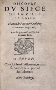 [VALDORY (Guillaume)]. Discours du siege de la ville de Rouen au mois de Novembre mil cinq cens quatre vingts onze. À Rouen, chez Richard l'Allemant, [1592].