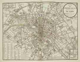 xixe siècle). 14 plans gravés à double page, brillamment aquarellés à l’époque. Atlas peu commun présentant, sur un même plan de la ville de Paris, aquarellé différemment selon la thématique : la topographie (rues, bâtiments et jardins) ; les limites des arrondissements et des quartiers ; celles des paroisses ; l’éclairage public divisé en cinq arrondissements ; le “nétoiement de Paris” ; les “chantiers de bois à brûler dans Paris” ; l’inondation de 1802, faisant la distinction entre les eaux qui ont couvert le sol et les eaux souterraines qui ont pénétré dans les caves ; les carrières souterraines ; l’emplacement des hôpitaux ; l’emplacement des marchés ; le tracé des conduites d’eaux qui alimentent les fontaines de Paris ; le tracé des égouts ; les “places des voitures en station sur le pavé de Paris” ; et enfin les services des sapeurs-pompiers, avec l’emplacement des casernes, des fontaines à robinets d’incendie, des corps de garde, etc. Maire apublié, à partir de 1808, plusieurs plans de Paris dans la tradition des plans topographiques du xviiie siècle. Le plan qui sert de base à cet atlas est inspiré du plan de Verniquet. Malgré sa petite échelle (environ 1/19000), on yvoit bien toutes les rues (et même le projet de percement du futur boulevard Diderot), les édifices publics, les grandes lignes du parcellaire et le bâti dispersé de la périphérie. Trois cartouches donnent le détail de la Ville-Neuve-aux-Gravois, du marché Saint-Martin et du marché de la Trinité. Plans en excellente condition, coloris très frais. Rousseurs au faux-titre, coins frottés. (Bonnardot, appendice p. 18 - Pinon & Le Boudec, 90).