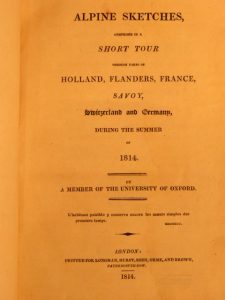 Récit de voyage dans les Alpes par un Membre de l'Université d'Oxford, malheureusement resté anonyme. Les pages 97 à 132 concernent la vallée de Chamonix. Nombreuses références à Jean-Jacques Rousseau. L'appendice 27 contient un intéressant témoignage de l'ascension de Saussure réalisée en 1787, extrait du journal d'un membre de la caravane. De la bibliothèque du Comte de Northesk, avec ex-libris. Nombreuses épidermures, charnières fendus mais mors solides, mouillure claire sur les premières pages. Pas dans Perret. – Engel, [259].