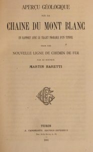BARETTI (Martin). Aperçu géologique de la Chaîne du Mont-Blanc en rapport avec le trajet probable d'un tunnel pour une nouvelle ligne de chemin de fer. Turin, J. Candeletti, 1881. In-8, 38 pp., broché.