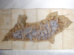 Établie après deux campagnes d'ascensions, dont certaines accomplies en compagnie de Whymper, cette belle carte du massif du Mont-Blanc est alors la plus complète et la plus exacte du massif. C'est aussi une des plus rares. Dimensions : 38,8 x 72,5 cm. Ex-libris manuscrit ancien (H. Woods). Nombreuses rousseurs visibles dans les marges. Aliprandi, [4.10].