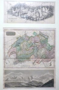 Carte des différents cantons helvétiques comprenant une partie du Faucigny, enrichie d'une gravure sur cuivre représentant le Mont-Blanc. Encadré avec une carte du massif du Mont-Blanc, établie d'après les cartes de Mieulet, Dufour et Adams-Reilly. Bel ensemble. Aliprandi, [3.9].