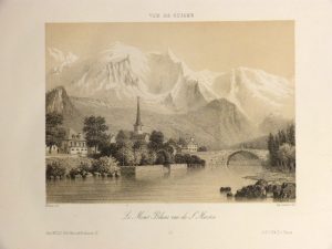 Superbe ouvrage illustré de 24 lithographies en bistre (34 x 26 cm) représentant les principaux sites du Mont-Blanc, de Chamonix et de sa vallée. Les lithographies, d'un bel état de fraîcheur, ont été gravées par Deroy, Muller, Ciceri, Benoît, Walter et Salathé. Rare album, dont la composition varie selon les exemplaires. Celui-ci contient bien les deux vues représentant la première ascension de l'Aiguille du Midi par le comte de Bouillé en 1856, ainsi que la célèbre vue de la Mer de Glace prise du Chapeau, toutes trois dues à Isidore Deroy. Un mors fendu. Pas dans Perret.