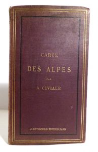 Première édition, illustrée d'une grande carte en couleurs dépliante des Alpes au 1/600 000e, entoilée. Envoi autographe signé de l'auteur. Édition séparée de la carte, parue avant l'ouvrage descriptif paru en 1882. Peu courant. Charnières fendues. Regards sur les Alpes, [93].