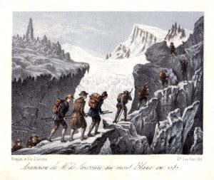 Première édition (tirage privé), illustrée d'un diagramme en frontispice lithographié par Hullmandel, d'un facsimile dépliant (certificat de l'ascension) et de quatre lithographies en couleurs contrecollées sur papier fort, d'après A. Cuvillier : Chamouni, Glacier des Bossons, Ascension de Mr de Saussure au Mont-Blanc en 1787 et Retour de l'ascension de Mr de Saussure au Mont-Blanc en 1787 (rajoutées à la reliure). Benjamin Hawes relate la dix-huitième ascension du Mont-Blanc réussie par son frère William en compagnie de Charles Fellows. L'ouvrage est publié avec le seul fac-similé du certificat d'ascension ; le diagramme y est souvent présent, les autres vues plus tardives (vers 1860) ont été rajoutées postérieurement. Bon exemplaire de cet ouvrage qui est aussi rare que le Fellows. Quelques épidermures. Perret, [2186] – Regards sur les Alpes, [48-A] – Meckly, [089] – Neate, [H55].