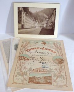 1) Deux photos des bains de Saint-Gervais avant et après la catastrophe du 11 juillet 1892 (tirages argentiques, 20 x 25 cm). – 2) Certificat d'ascension du Mont-Blanc, 1926 (1 planche en couleurs, 30 x 41 cm). – 3) The Illustrated London News, Recent ascent of Mont-Blanc (1851) et A party crossing the Mer de Glace (1858), avec des gravures sur bois.